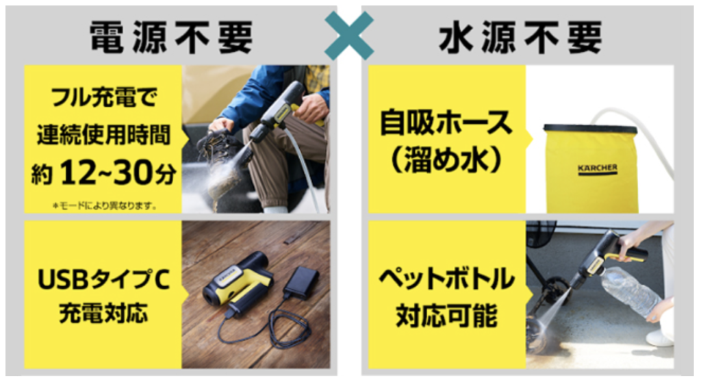 • 場所を選ばない: ペットボトル給水により、水道や電源がないアウトドアシーンでも活躍する