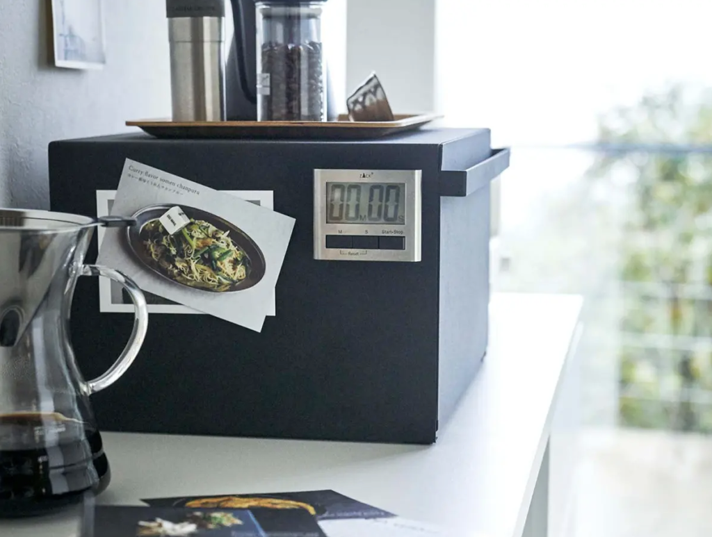 側面にマグネット式のフックをつけて輪ゴムやミトンを引っ掛けたり、キッチンタイマーを貼り付けたり、お気に入りのレシピメモやポストカードを留めておいたり。自分好みにカスタマイズできる拡張性の高さは、プラスチックや木製のケースにはない大きな強みです。ただの収納箱にとどまらず、キッチン周りの細々したアイテムを一つにまとめる「情報と収納のハブ」として機能してくれます。